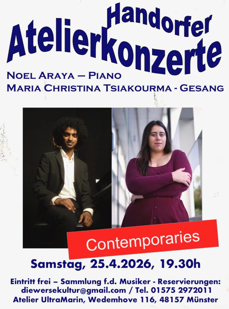 Zum letzten Konzert unserer Wintersaison 2025/26 haben wir am 25.4.2026 Noel Araya und Maria Christina Tsiakourma zu Gast.