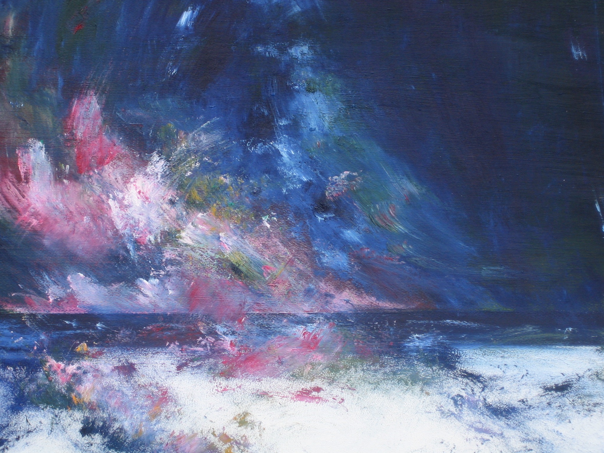 Die Himmel über dem Meer sind immer wieder begeisternd und inspirierend für meine Malerei. Die Farben, Lichtreflexe und Szenerien sind einfach faszinierend. Bei diesem Bild wählte ich die Technik, die Ölfarbe auf einem speziellen Papier sehr dünn aufzutragen. Dazu benutzte ich einen Spachtel. Trotz des jeweils dünnen Auftrags legte ich mehrere Schichten über einander, um diesen gewünschten Effekt, diese Stimmung, zu erzeugen. Den Vordergrund, das gleißende Licht, ließ ich frei.