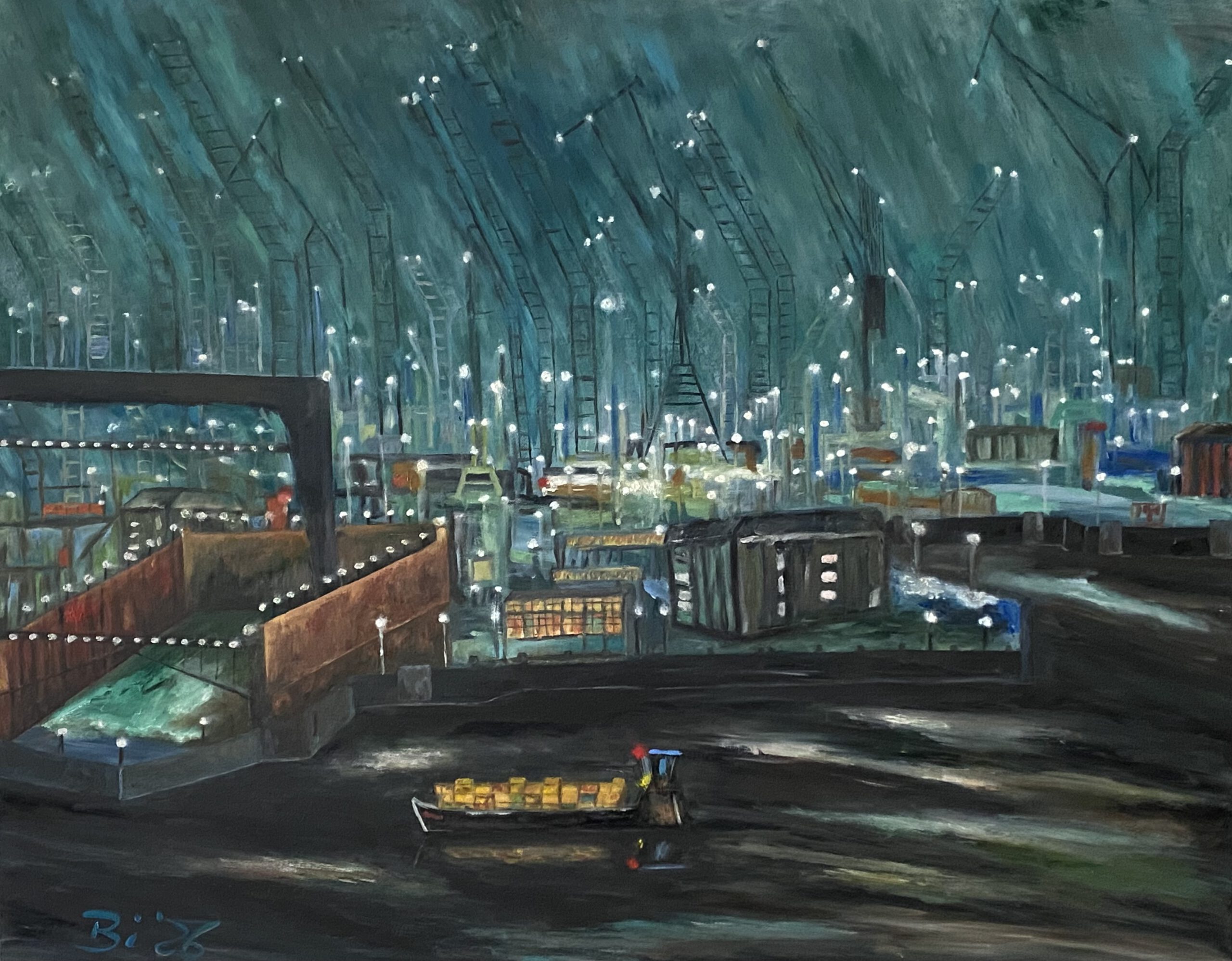 Nach Rückkehr in mein Atelier mußte ich diese Szenerie, diese frische Impression, unmittelbar auf einer Leinwand umsetzen. Natürlich wählte ich dafür Ölfarben. Die Lichter des Hafens konzentrieren sich auf die Bildmitte, aber auch die einzelnen Lichter an den Kränen leuchten, unterschiedlich stark, in diesem hohen Nachthimmel. Für die Licht-Aura um die Scheinwerfer und Laternen, erzeugt durch die Schneeschauer, benutzte ich relativ viel Malmittel, welches die weiße Farbe im Umkreis etwas verlaufen, die Konturen verschwimmen ließ.